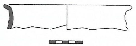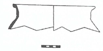 Un autre pot (fig. 7) tourné toujours dans la même pâte fine est individualisé par sa partie supérieure. Son col est élevé, le bord évasé épaissi vers l’extérieur, la lèvre est ronde. La surface à l’extérieur, sauf au niveau de la lèvre, est gris-jaune. La cuisson a d’abord été réductrice, puis oxydante, suivie d’un enfumage. La surface gris-jaune ne s’explique que par la présence d’un engobe de nature différente de la pâte n’absorbant pas les vapeurs de goudron.