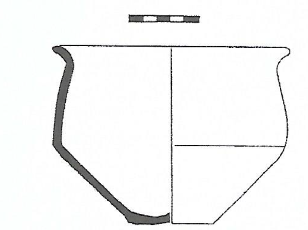 Une carène bien marquée limite le col et la panse dont les profils accusent une légère convexité. Le bord est éversé, la lèvre ronde. La pâte est grossière avec des débris de roches métamorphiques. Les traces de tournage sont bien visibles à l’intérieur, mais l’extérieur a été extrêmement bien lissé, sans être lustré. La cuisson fut d’abord réductrice (noyau noir) puis oxydante (franges bien rouges) et a été terminée par une phase d’enfumage soignée (la surface est d’un noir profond). Le fond est usé.