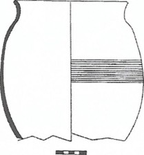 Elles sont représentées par un très grand nombre de tessons ayant appartenu à plus de dix vases, mais un seul peut être presque entièrement reconstitué graphiquement (fig. 6). Il s’agit d’un pot à fond probablement plat, à col évasé et à lèvre ronde. Le col est séparé de la panse par un dénivelé à peine perceptible que l’on obtient en général en utilisant une estèque métallique. La panse est décorée de sillons lustrés obtenus avec une pointe émoussée. Le dégraissant est peu abondant. La cuisson réductrice puis oxydante n’a pas été suivie d’un enfumage. Le même type de vase est représenté par deux fonds plats et Figure 6 : Pot reconstitué épais, tournés dans la même pâte dont les faces inférieures ont été lissées. Quatre tessons de vases tournés dans la même pâte que les autres prouvent la fabrication et l’utilisation locales de récipients fermés de plus de 40 cm de diamètre.