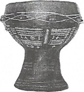 Les tambours sont souvent utilisés pour marquer le rythme dans la danse. Ils sont aussi parfois un moyen de communiquer à distance, les différents rythmes formant une sorte de code. H. Behrens considère les tambours du Néolithique moyen Il/ III (3eme millénaire avant J.-C.) de la culture T.R.B.K. (culture des Gobelets à entonnoirs) répartis en Scandinavie méridionale, dans le nord des Pays-bas, de l’Allemagne et de la Pologne, comme des instruments rythmiques utilisés dans les cérémonies cultuelles. Plutôt que d’y voir, selon lui la possession unique d’un chaman, ces tambours trouvés en grand nombre sur un même site, seraient destinés à rythmer des danses cultuelles (Behrens 1979-1980). Le rôle probable de ces tambours dans le culte est souligné par les nombreux symboles (croix, croissants, « yeux », soleil) qui ornent ces céramiques (fig. 10-2). De même que par leur contexte de découverte, puisque l’ensemble de ces instruments ont été mis au jour dans des sépultures (adultes et enfants, hommes et femmes). Les céramiques, identifiées comme de probables tambours des âges des Métaux telle celle de Loderup (Suède), ne possèdent aucun ornement. Leur faible nombre et leur contexte de découverte laissent suggérer une utilisation probablement cultuelle de l’instrument, peut-être faut-il y voir aussi un marqueur du statut social du possesseur. Rappelons enfin, que ce sont des instruments tout particulièrement difficiles à identifier avec certitude.