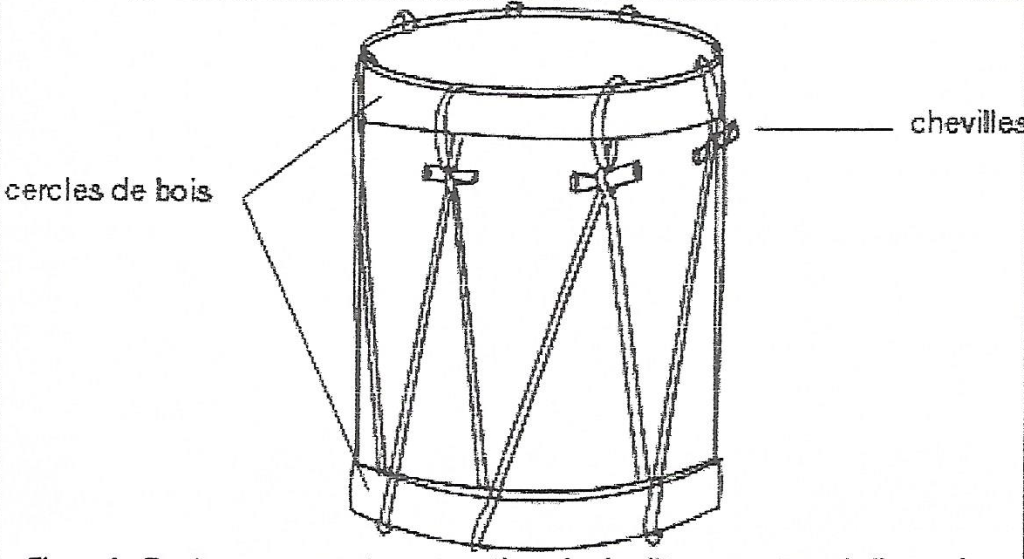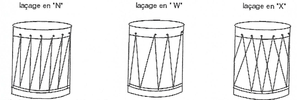 D. Dans certains cas, le tambour peut-être pourvu de deux membranes ; elles sont fixées par un laçage sur un cercle.