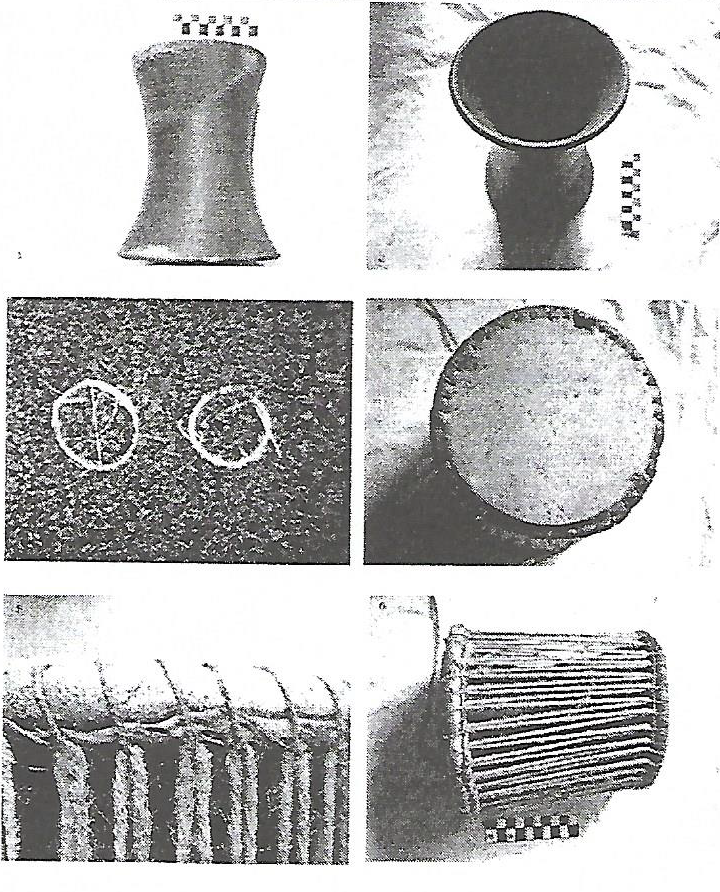 A. La peau est donc collée et fixée à l’aide de boutons présents sur le fût en céramique, parfois un système de laçage peut compléter la fixation de la membrane-. Ce système était utilisé sur les céramiques-tambours du néolithique découvertes en Europe du Nord qui présentent pour la plupart un grand nombre de petites anses ou de boutons sur leur pourtour ayant servi à maintenir une membrane (fig. 10).